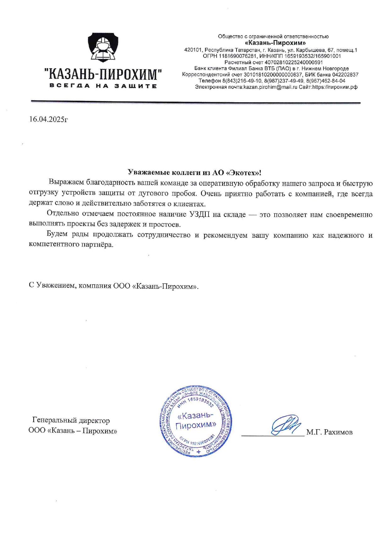 Выражаем благодарность вашей команде за оперативную обработку нашего запроса и быструю отгрузку устройств защиты от дугового пробоя. Очень приятно работать с компанией, где всегда держат слово и действительно заботятся о клиентах