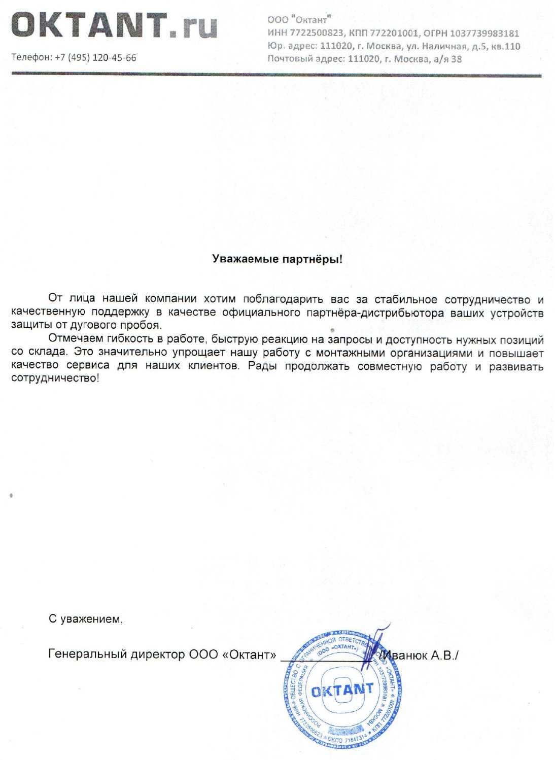 От лица нашей компании хотим поблагодарить вас за стабильное сотрудничество и качественную поддержку в качестве официального партнера-дистрибьютора ваших устройств защиты от дугового пробоя